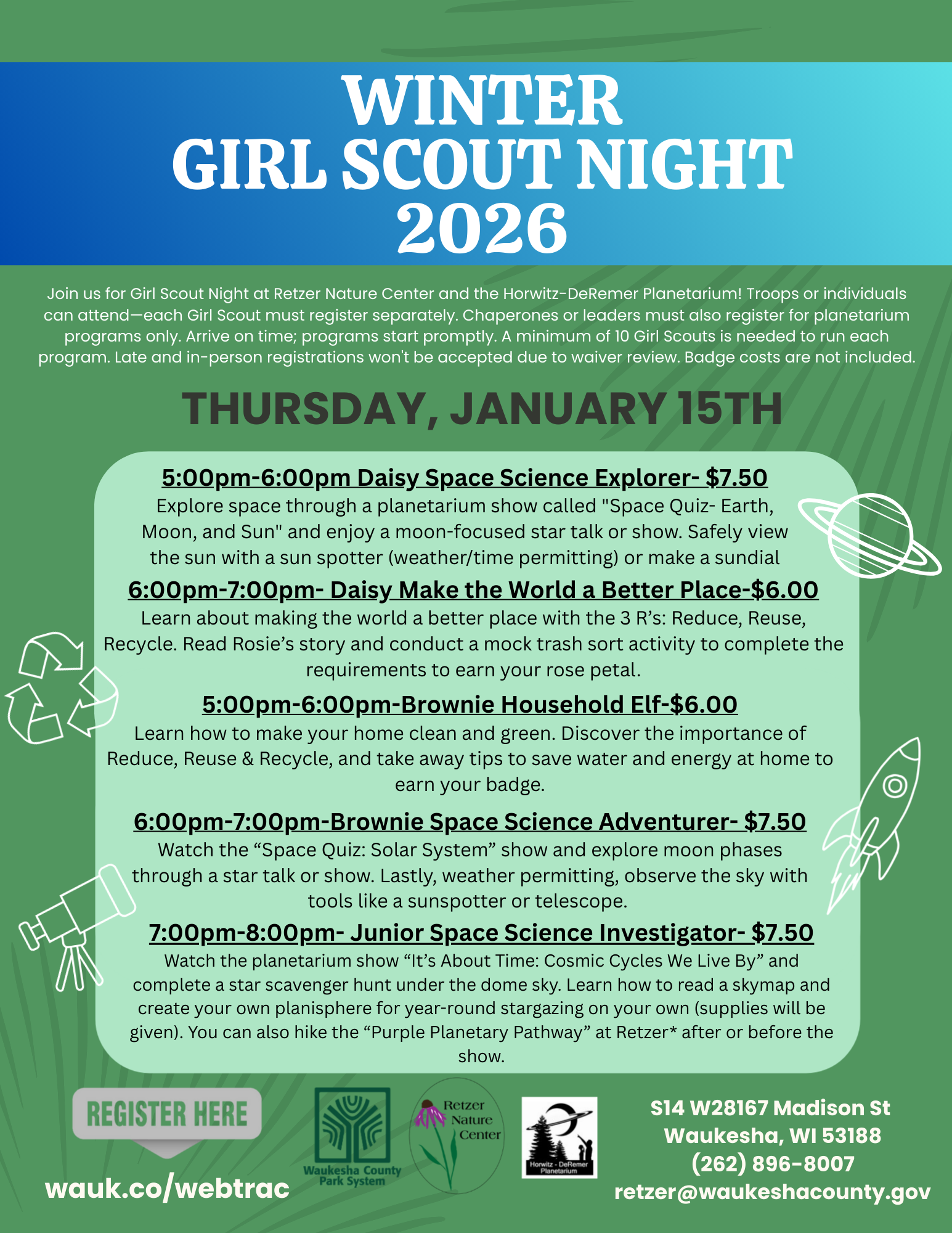 Join professional naturalists to explore Earth's astonishing treasures during programs featuring fun-filled, hands-on, confidence building activities designed to meet Girl Scout badge requirements.